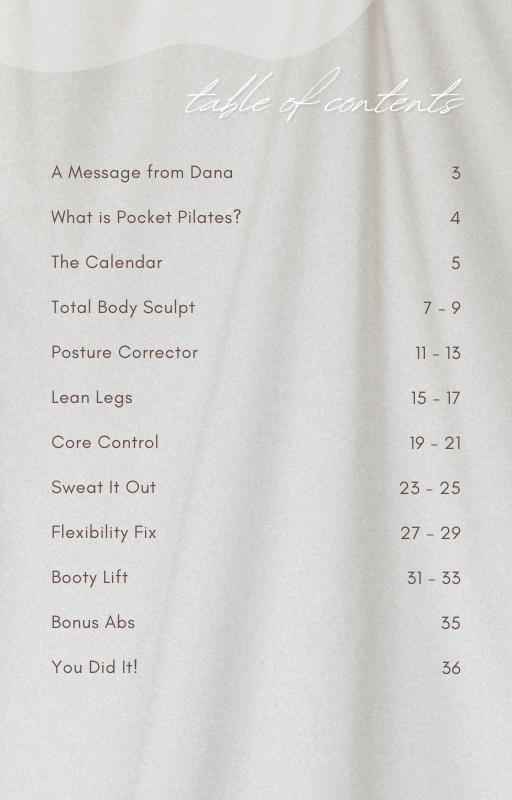 Pocket Pilates* is a 21-day program of short, effective, and equipment free Pilates inspired workouts that can be done anytime and anywhere.